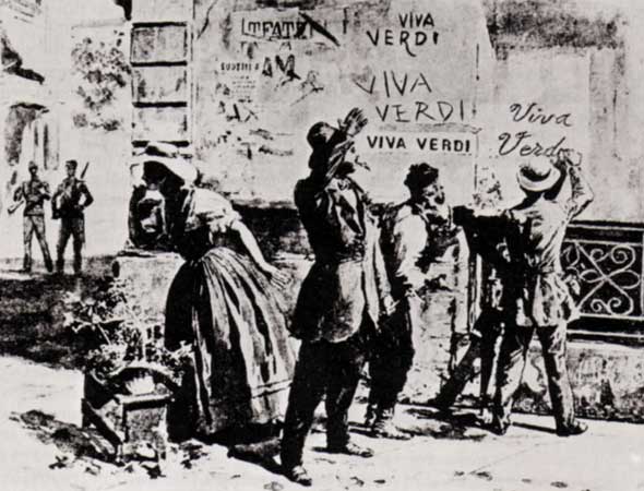 Il est également connu — quoique peut-être un peu moins — que le cri VIVA VERDI signifiait en réalité Viva Vittorio Emanuele Re d’Italia, et qu’il servit à désigner, en son temps, le roi appelé à gouverner une Italie libre et unifiée.